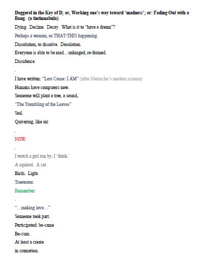 I cannot imagine to whom it might matter that I am stumbling out sentences with nothing in mind other than WRITING, TO-BE-WRITING – excepting my insignificant eperiencing of “self” that WANTS TO BE WRITING – in any case. Therefore, I AM writing.